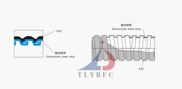 材質(zhì):采用鍍鋅鋼帶或不銹鋼201或304及特殊防腐處理+特殊絕緣材料、耐腐蝕材料外包塑;內(nèi)JS外PVC或PU包塑組成, 外層包塑低煙無毒環(huán)保,表