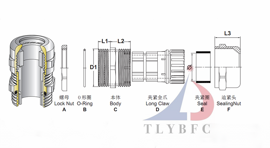 產品特性:特殊夾緊爪與夾緊圈之設計,夾緊電纜范圍大,抗拉力特強,可防水、防塵抗鹽、耐弱酸、酒精、油、油脂及一般溶劑。